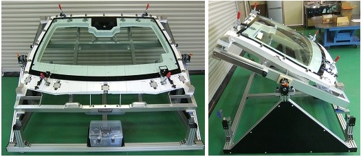 自動車構成艤装部品( EXTRA WINDOW GLASS )の組み立て専用治具(専用機)